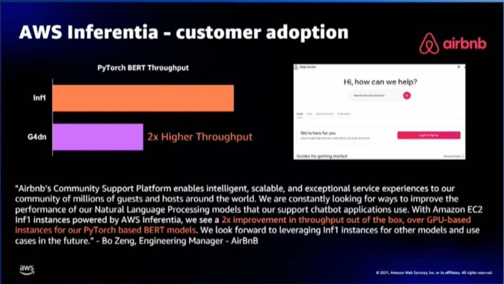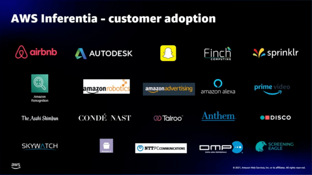 Inferentia面世不久就收获了许多大大小小的客户。在Amazon内部,我们最大的客户是Alexa,用我们的芯片把Alexa加速了25%,成本降低了30%。在Amazon外部,我们最开始的客户包括Airbnb, Snapchat, Pinterest等,后来又逐渐吸纳了Bytedance, Facebook, Apple等大公司。