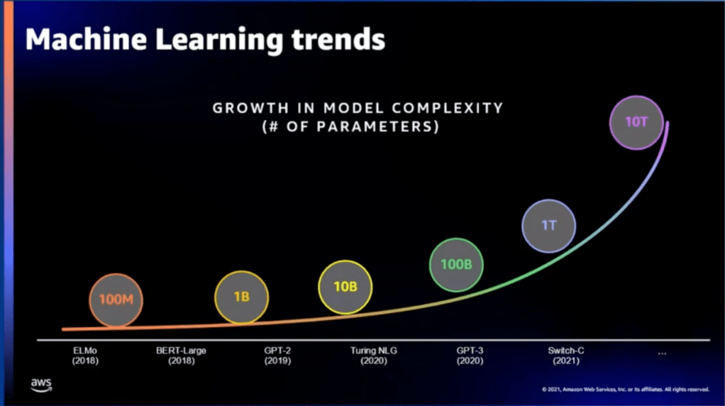 这里必须提一下业界老大哥Nvidia英伟达。Nvidia从几十年前就开始造GPU,经验丰富。这些年他们接连推出T4, A10G, A100等针对机器学习的GPU。根据2020年的市场调查,Nvidia在AI芯片的市场占比在80%以上。有趣的是,Nvidia和AWS其实是紧密的合作伙伴,T4/A10G在AWS上叫G4dn/G5 instance, A100在AWS上叫P4d/P4de instance。