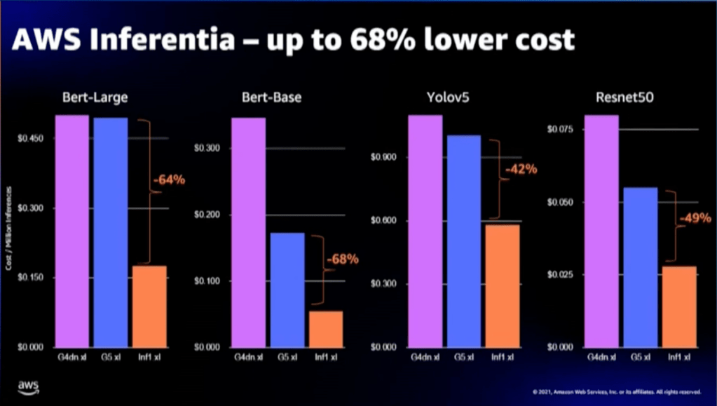 我们芯片的原理和GPU完全不同,不过我们必须得比GPU的性能更好才能吸引到顾客。我们的Inferentia在最常用的那些模型上比G5平均快了30%,便宜了50%。