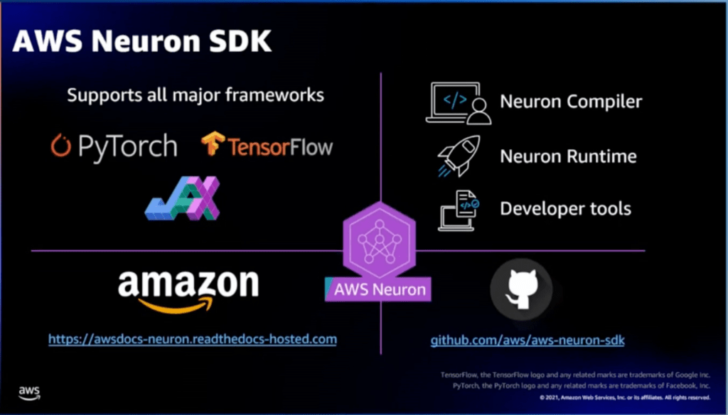 另外,光有好性能还远远不够,顾客的体验和易用性同样的重要。对此,我们有一整套软件的服务。顾客从GPU instance迁移到inf1/trn1上,只需要在tensorflow/pytorch里面加不到五行代码。
