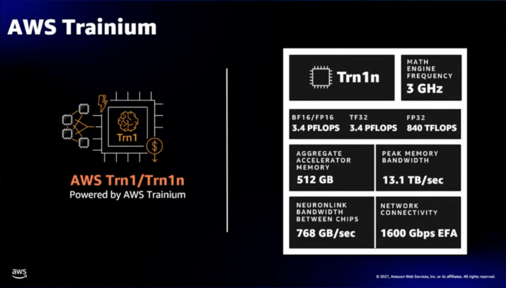 Inferentia获得成功之后,团队又开始马不停蹄的开始下一代芯片Trainium的开发。Trainium不仅在inference上面比Inferentia强了许多,而且支持training。经过了两年的努力,Trainium芯片和相应的trn1 instance终于要正式上线了!