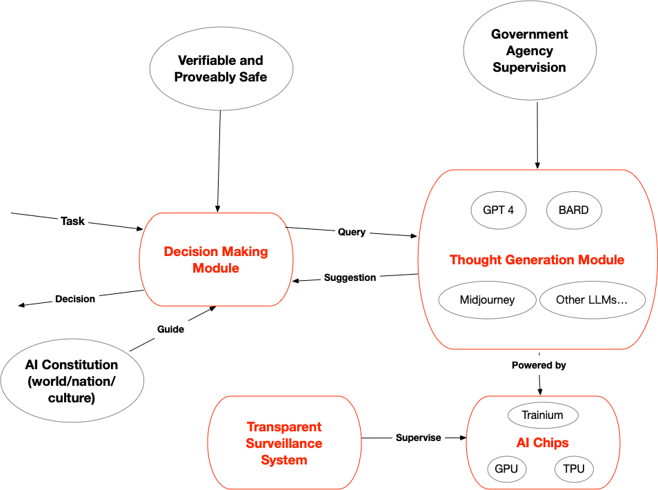 对此,我觉得需要两层的监管制度。在上层,对于每个大模型,我们都需要开源代码,然后有专业的机构去验证,去证明它只是一个TLM,只能提建议而无法执行。
