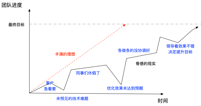 没有完美的项目也没有完美的执行。越是多人参与,复杂度高的项目,进度就越是一条匍匐前行的曲线。项目牵头人就得像预言家一样,提前预知这些会出现的困难,并团结村名们做出应对。前期可以激进而多条线平行发展,到了某一个点之后,就要抓紧converge,把大家的工作都糅合到一个working solution,再以这个working solution为基础,在保持convergence的基础上一步步达到最终的目标。